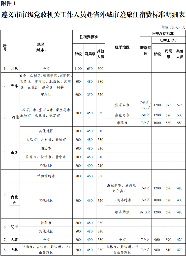 遵义医药高等专科学校工作人员省内差旅住宿费标准明细表